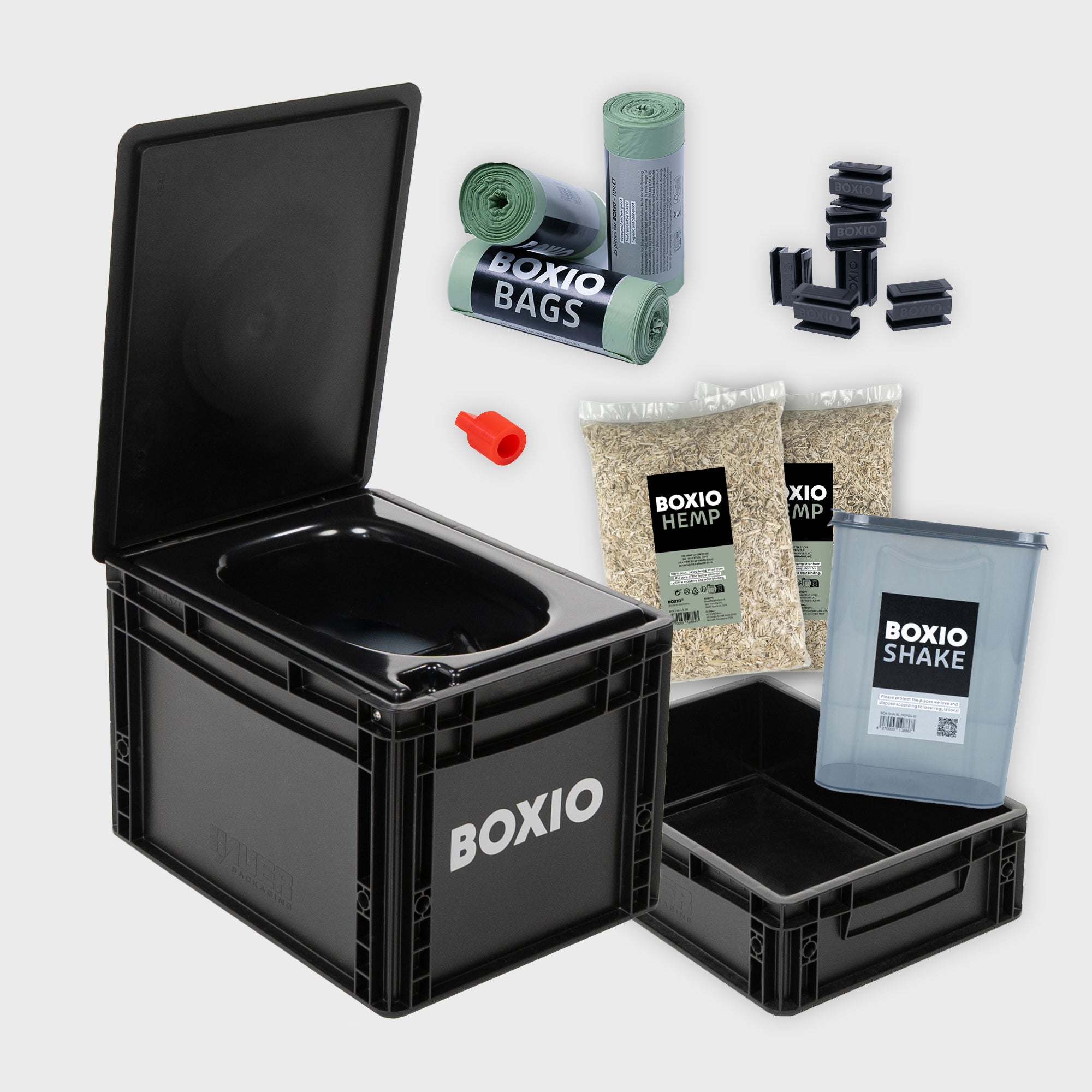 Boxio Toilet mit Wasser im Hintergrund und Streu und Tüten liegen auf der Box