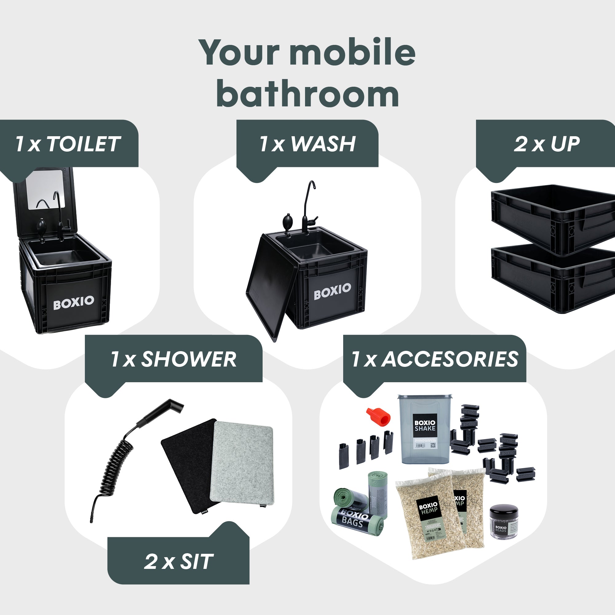 Schwarze Box mit offener Klappe, gefüllt mit BOXIO-Produkten: Bioplastiktüten, Hanf, Shake und Zubehör.Komposttoiletten-Komplettset mit Toilette, Taschen, Hanf, Shake, Stecker und Clips in übersichtlicher Anordnung.